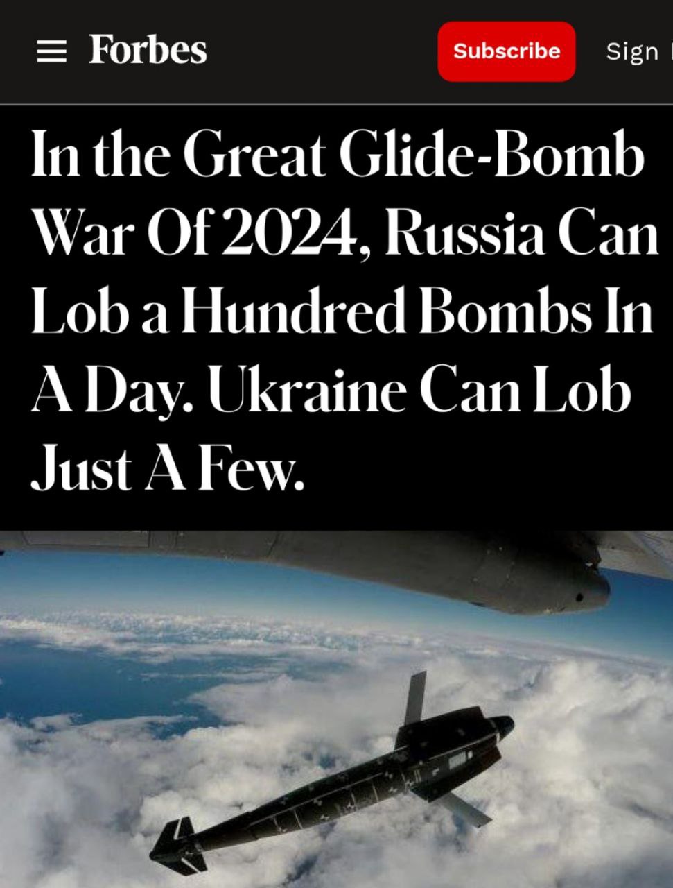«Российские истребители-бомбардировщики Су-34 в сопровождении истребителей Су-35 ежедневно совершают сто и более вылетов, сбрасывая на украинские позиции планирующие бомбы со спутниковым наведением. Украинская сторона раньше отвечала противнику сбросом американских бомб Joint Direct Attack Munition, но после блокировки передачи таких снарядов республиканцами, перешла на планирующие авиабомбы французского производства. И хотя стабильные поставки французских бомб в некоторой степени компенсируют американские JDAM, 50 бомб в месяц — слишком мало, чтобы сравниться с сотней или более таких снарядов, которые русские могут сбрасывать каждый день.