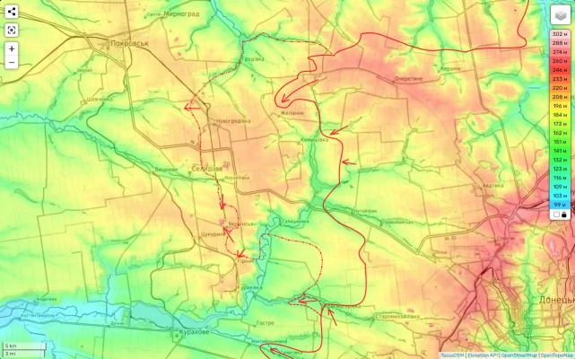Здесь продолжаются бои за Украинск, который наши части хотят взять в клещи. Весь день продолжались бои в южной части города, а также на подступах к нему с севера.