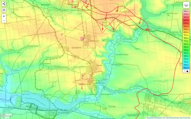 Части противника здесь все менее и менее упорны в обороне и понимают свою обреченность. А новых резервов нет — они на Курщине. А потому фронт и откатывается здесь буквально каждый день на значимые расстояния. Причем каждый раз при этом ставя другие части ВСУ под угрозу охвата или окружения. В данном случае угроза уже идет даже не Карловке, а Галициновке (до последнего момента важного логистического хаба противника на Красногоровском участке.