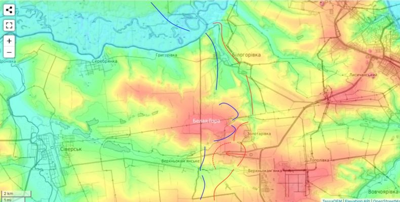Если мы посмотрим на рельефную карту местности, то увидим, что ключом устойчивости обороны ВСУ здесь является Белая гора, которая возвышается на многие десятки метров над окружающей территорией (а если брать центральную часть н.п. Белогоровка то примерно на 140 метров) и с нее очень хорошо видно все вокруг на пару десятков километров.