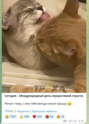 Самым лучшим подтверждение того, что у нас все пока на фронте хорошо, а у противника все плохо, это то, что на их околовоенных патриотических ТГ-помойках постят «котиков», «Лигу Чемпионов», «губастых блондинок» и прочее.