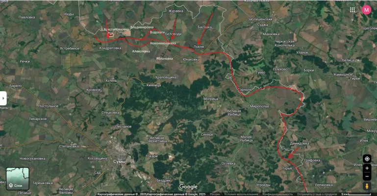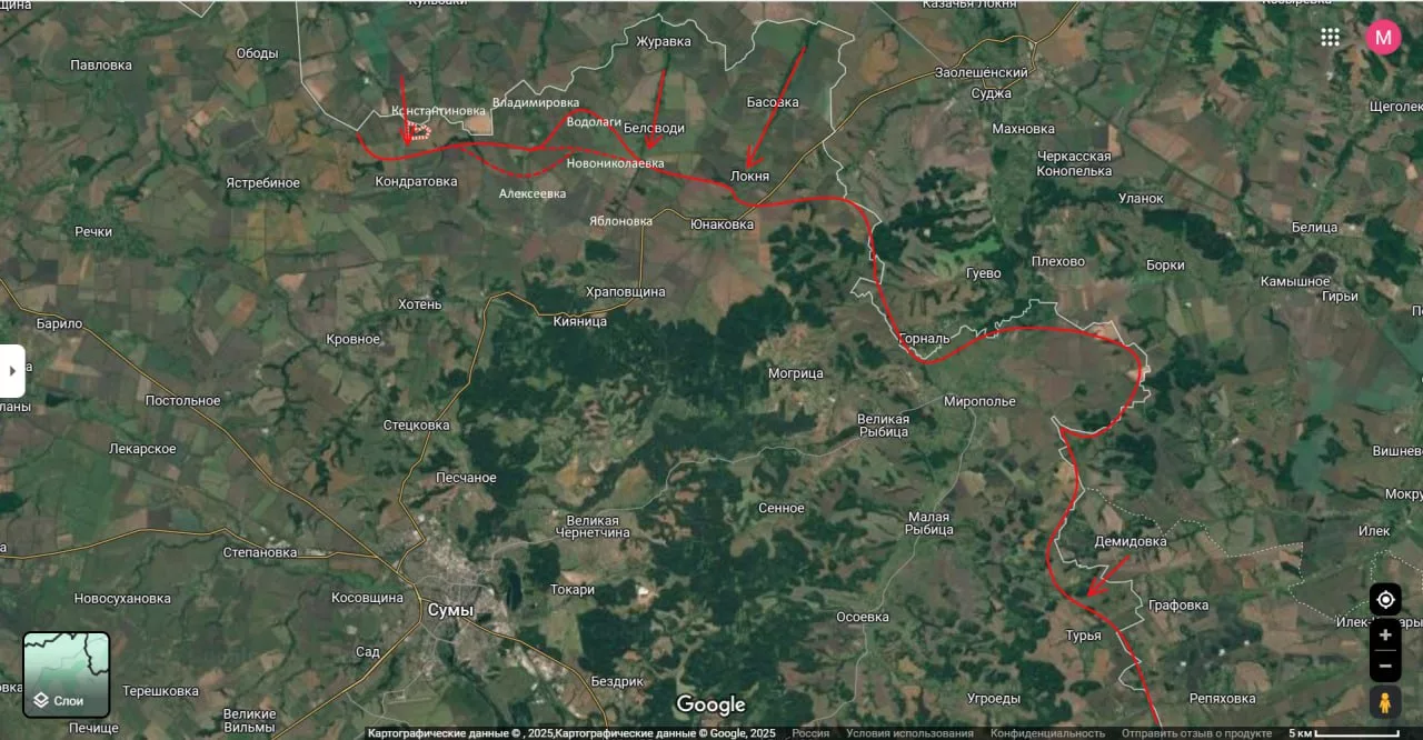 Также идут бои на северных окраинах Юнаковки и по направлению к Яблоновке. Таким образом ВС РФ продолжают усиливать натиск на фронт противника севернее Сум и добиваются здесь успехов.