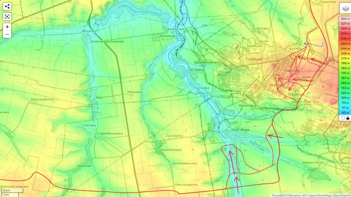 Во-первых, продолжая развивать прорыв в районе н.п. Пивденное наши части сходу вошли и закрепились в южной части его высотной застройки. Таким образом, они вышли с юно-востока к главному уркрепрайону ВСУ перед Торецком — террикону и зданиям шахты Северная, утеря которых заставит ВСУ быстро уйти в Торецк, который к тому же в этом случае будет довольно сложно продолжать защищать.