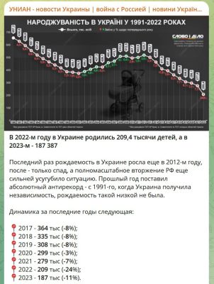 В 2023 году она упала еще на 11%. Причем, как мы видим по ежегодным цифрам дело не только в войне (хотя она и усугубила ситуацию). С 2017 года цифра упала вдвое, причем сокращалась она очень и очень быстро и до 2022 года. Причина проста. Многие украинцы, понимая бесперспективность жизни на постмайданной Украине, убегали из страны. А война лишь этот процесс усугубила.