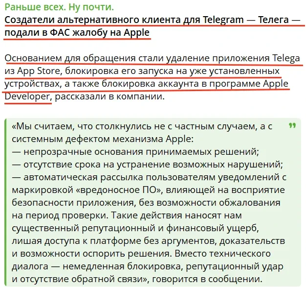 Что явно обеспокоило тех, кому очень не хотелось терять контроль над российской аудиторией (накануне важных исторических событий). И буквально сразу же в сецсетях появились массово «разоблачающие материалы», что Telega это плохо. Что это «шпионский продукт» (так и хочется спросить разоблачителей — а что такого рода продукты бывают «не шпионскими»?). И буквально сразу же Apple удалила Telega из своей App Store.