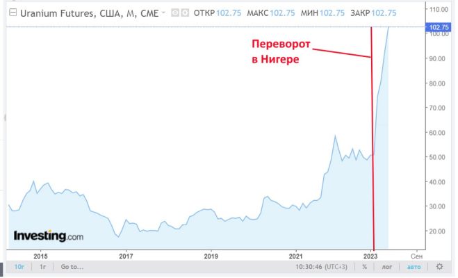 Смотрим на биржевые цены на стратегический товар — Уран (который в больших объемах добывают именно в Нигере). Она сегодня пробила психологическую отметку и устремилась куда-то ввысь (на фоне перекрытия поставок урана из этой далекой африканской страны)