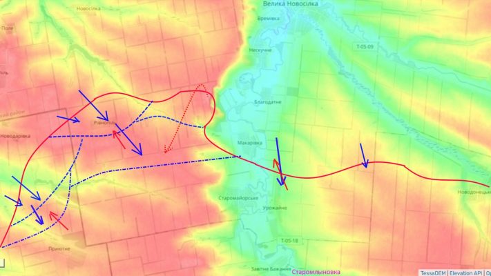 Несколько дней к ряду он атакует на Великоновоселовском направлении, где сумел накануне взять несколько наших позиций на высотах, а ночью он попытался было развить свой успех, атаковав н.п. Старомайорское. Эта атака была отбита, но противник, нащупав слабость (а это стык зоны ответственности 5А и ОБТФ «Каскад»), продолжает свои попытки.