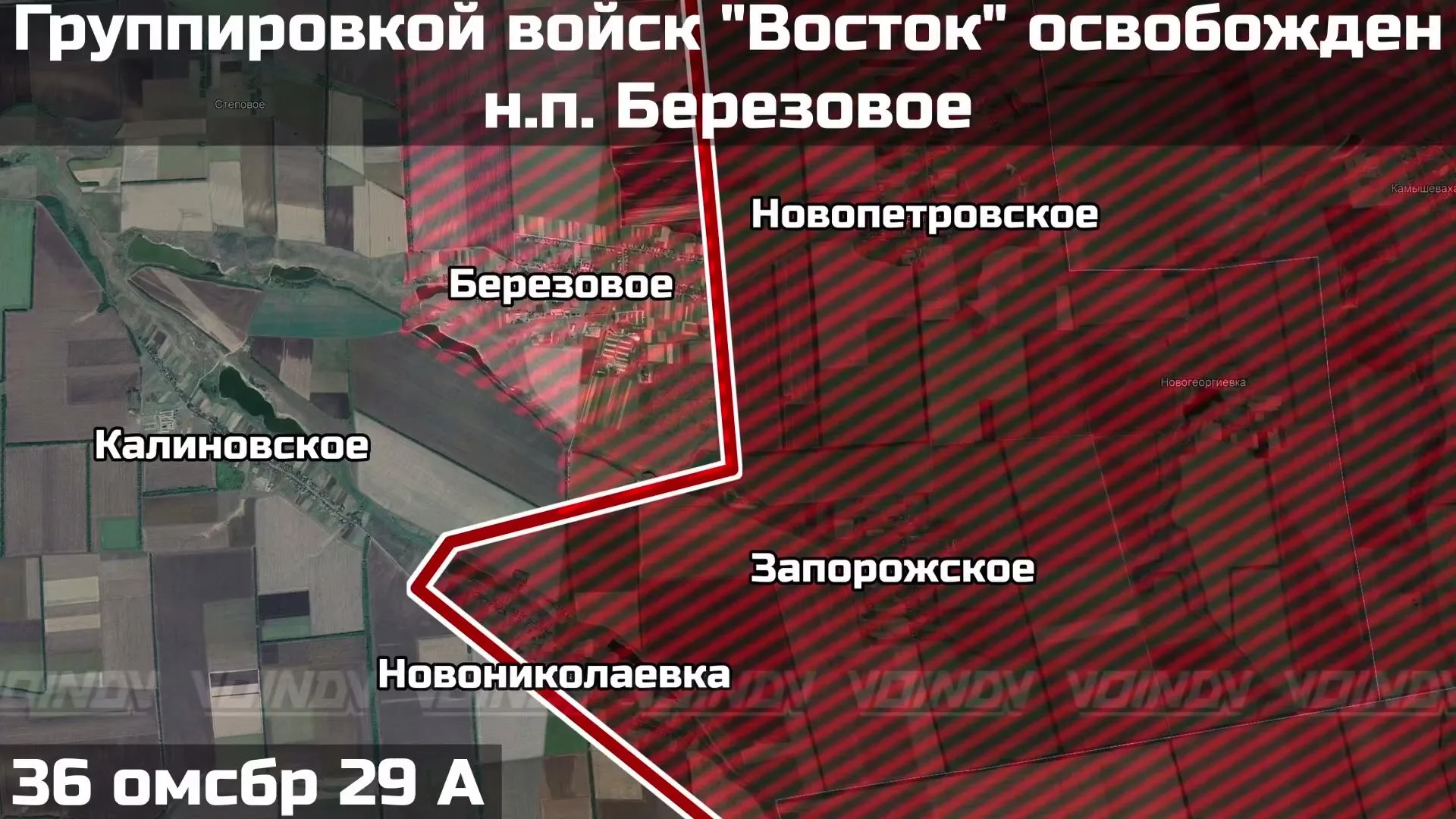 - После ожесточённых боёв подразделениям ВС РФ удалось полностью взять под контроль Берёзовое. Противник оказывал упорное сопротивление, однако в результате планомерного давления и действий штурмовых групп населённый пункт был освобождён. Противник, понеся потери, отошёл в западном направлении. Контроль над Берёзовым открывает новые возможности для давления на Калиновское и создаёт устойчивый рубеж в тылу.