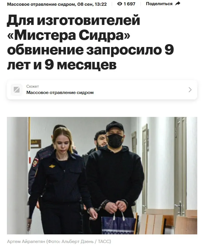 ▪️В 2023 году они пустили на рынок более 30 тысяч литров алкоголя под маркой «Мистер Сидр», изготовленного из метилового спирта, похищенного со склада центра хозяйственного обеспечения МВД.