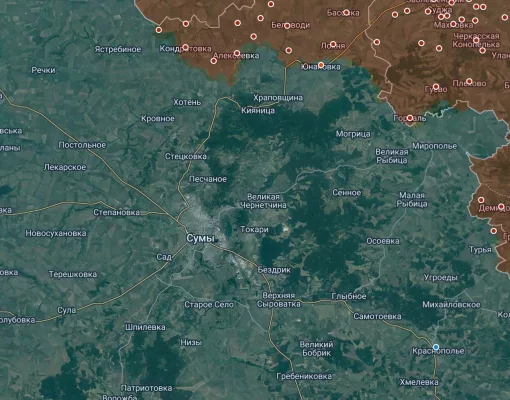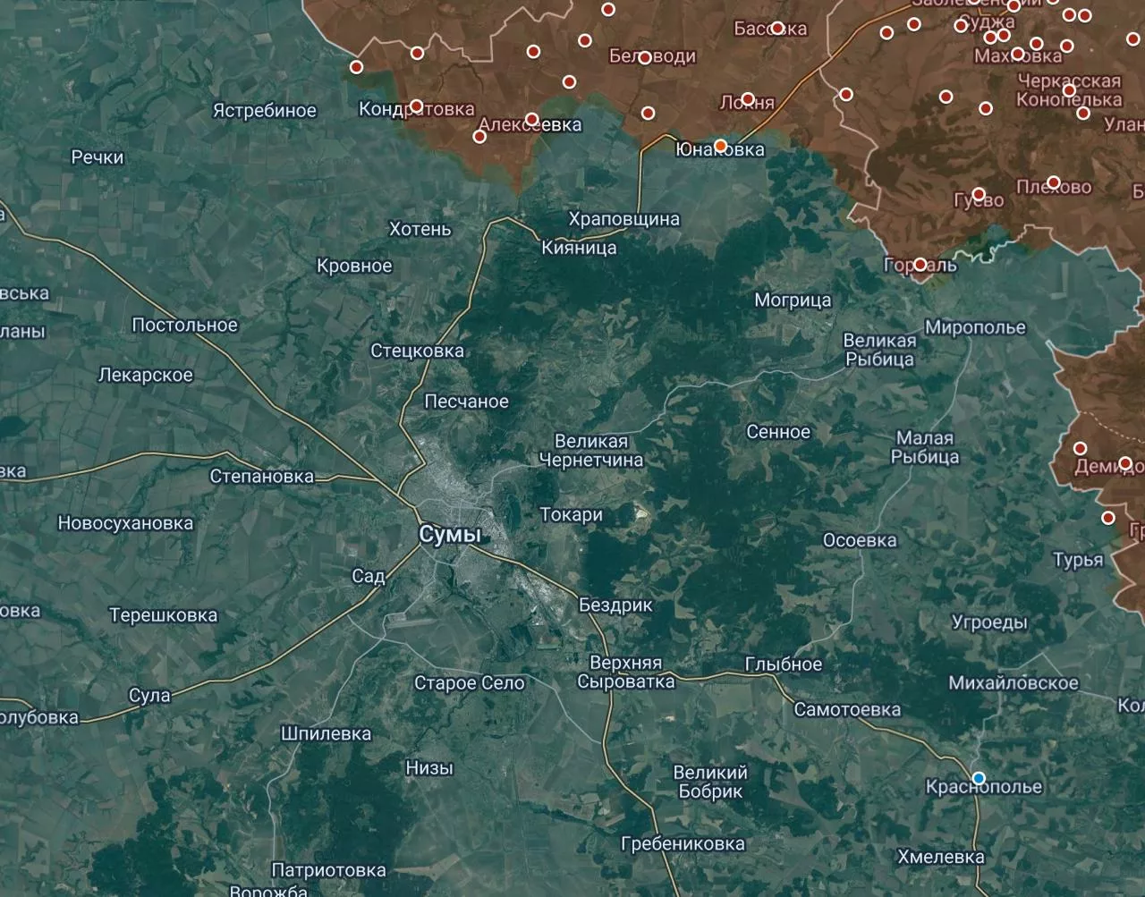 Теперь — Сумская область. Инициатива здесь уже не у ВСУ, а у российской стороны. Бои сопровождаются относительно неплохим продвижением в глубину, захватом населённых пунктов и постепенным давлением на областной центр. Пока всё располагает к тому, что продвижение будет и дальше.