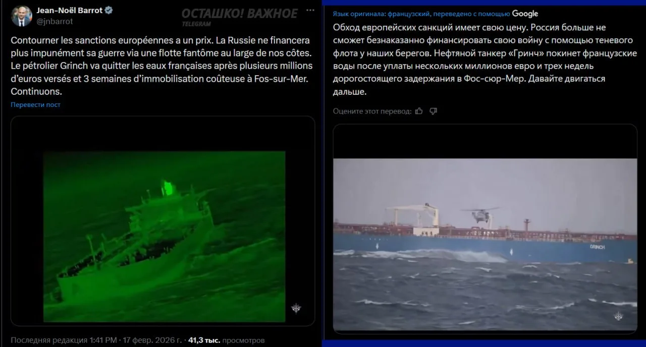 «Обход европейских санкций имеет свою цену. Россия больше не сможет безнаказанно финансировать свою войну с помощью теневого флота у наших берегов. Нефтяной танкер «Гринч» покинет французские воды после уплаты нескольких миллионов евро и 3 недель дорогостоящего задержания в Фос-сюр-Мер. Давайте двигаться дальше», — написал он в 𝕏.