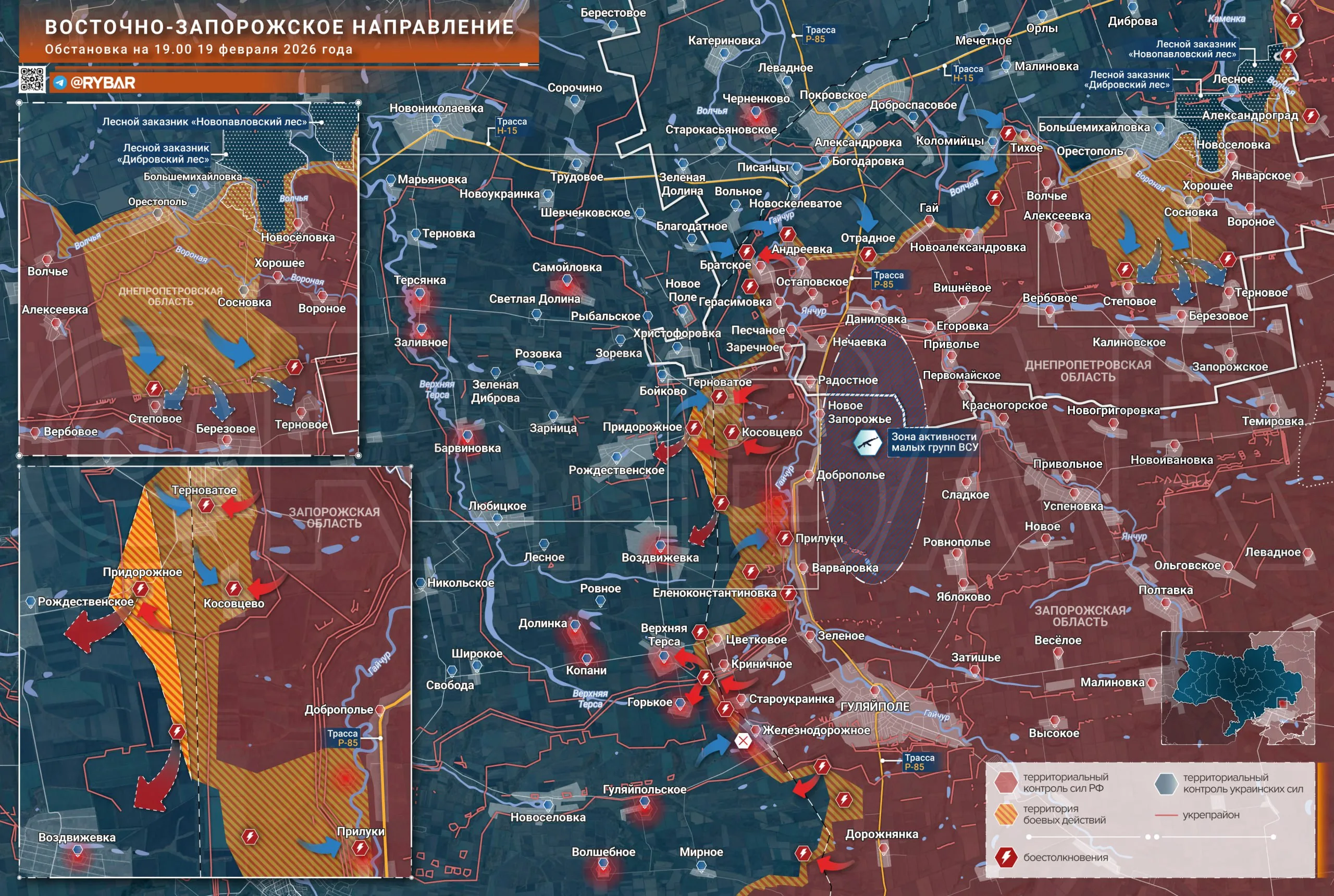 📌 В районе Гуляйполя попытки украинских формирований «стабилизировать фронт» существенных результатов не дали. В результате регулярных ударов дронов большинство штурмовых групп ВСУ поражаются еще на подходе к позициям. Продвижение российских подразделений удалось лишь на некоторое время замедлить, но не остановить. По предварительным данным, ВС РФ уже подходят к Горькому и Верхней Терсе.