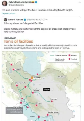 Об этом в Х написал экс-министр иностранных дел Литвы Габриэлюс Ландсбергис, комментируя карту с отмеченными иранскими объектами.