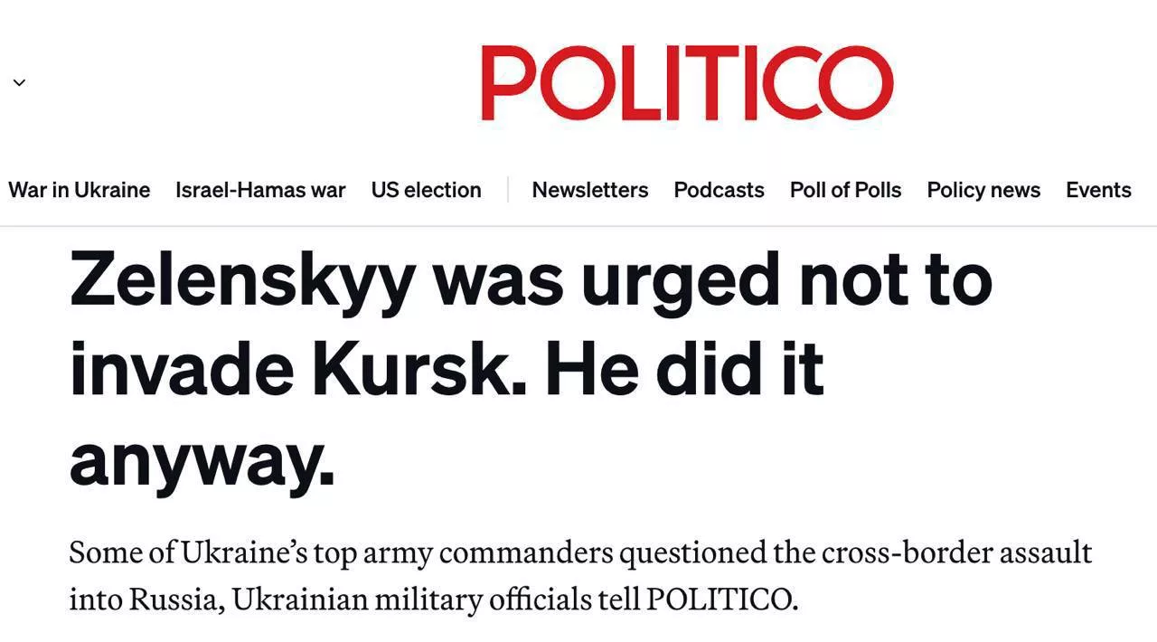 Politico: Залужный был против наступления на территорию РФ, когда Зеленский впервые поднял эту тему в начале года и настаивал на проведении такой операции.