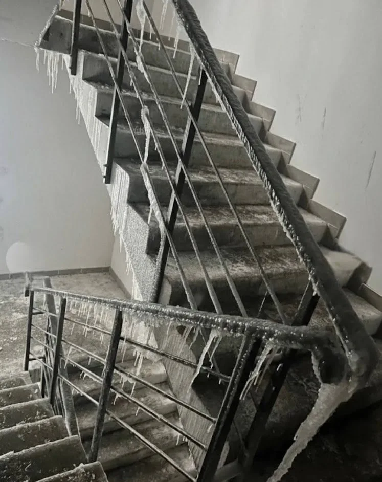 - В Киеве один из подъездов жилого дома полностью покрылся толстым слоем льда — соответствующие кадры публикуют украинские тг-каналы. На изображениях видно, что с поручней лестницы и ступенек свисают большие сосульки.