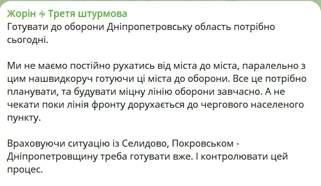 «Готовить к обороне Днепропетровскую область нужно сегодня. Мы не должны постоянно двигаться от города к городу, параллельно с этим наскоро готовя эти города к обороне. Все это нужно планировать, и строить прочную линию обороны раньше времени. А не ждать, пока линия фронта двигается в очередной населенный пункт», – заявил известный офицер-неонацист Максим Жорин.