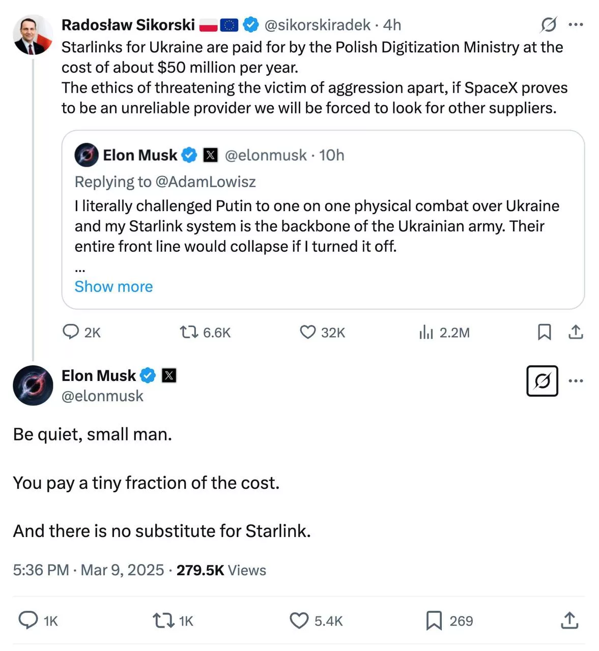 Ранее Туск написал Маску, что Польша тратит $50 млн в год на Starlink для Украины и если SpaceX окажется ненадежным поставщиком, Польша будет искать другие варианты.