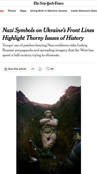 Самая либеральная помойка в США The New York Times разразилась статьей о тату и нашивках укронацистов, которыми те кичатся в соцсетях. Стоит подметить, что нацистская символика, которую Запад отрицает в течение всего времени проведения СВО, также попадала и в эфиры национального европейского и американского ТВ.
