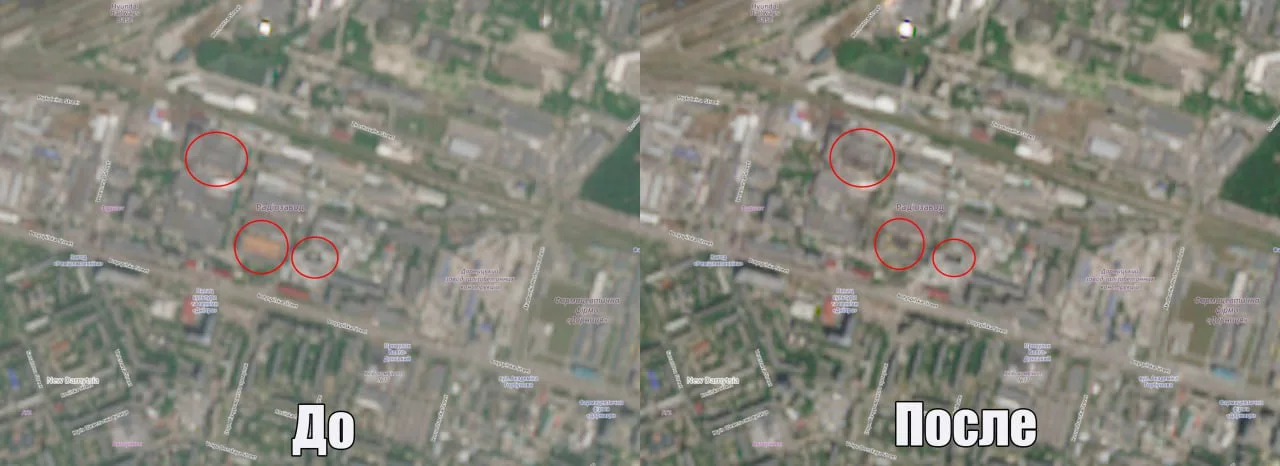 Еще один бывший цех КРЗ — 5-й — вмещал в себя производственно-технический комплекс «Механик» и тоже очень серьезно пострадал. Третье попадание, которое можно разобрать, пришлось, похоже, между зданиями «Оптима-Фарм» и «БиТи Украина».