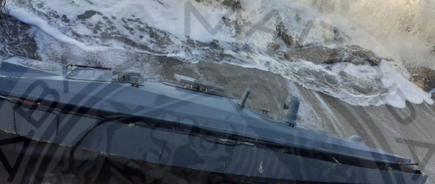 На берегу обнаружен сломанный украинский безэкипажный катер. Обычно такие противник начиняет взрывчаткой для совершения террористических атак.