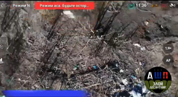 Наши сбросами с БПЛА выжигают нацистов на позициях. Один контуженый, выбравшись из окопа, в панике блуждает по посадке.