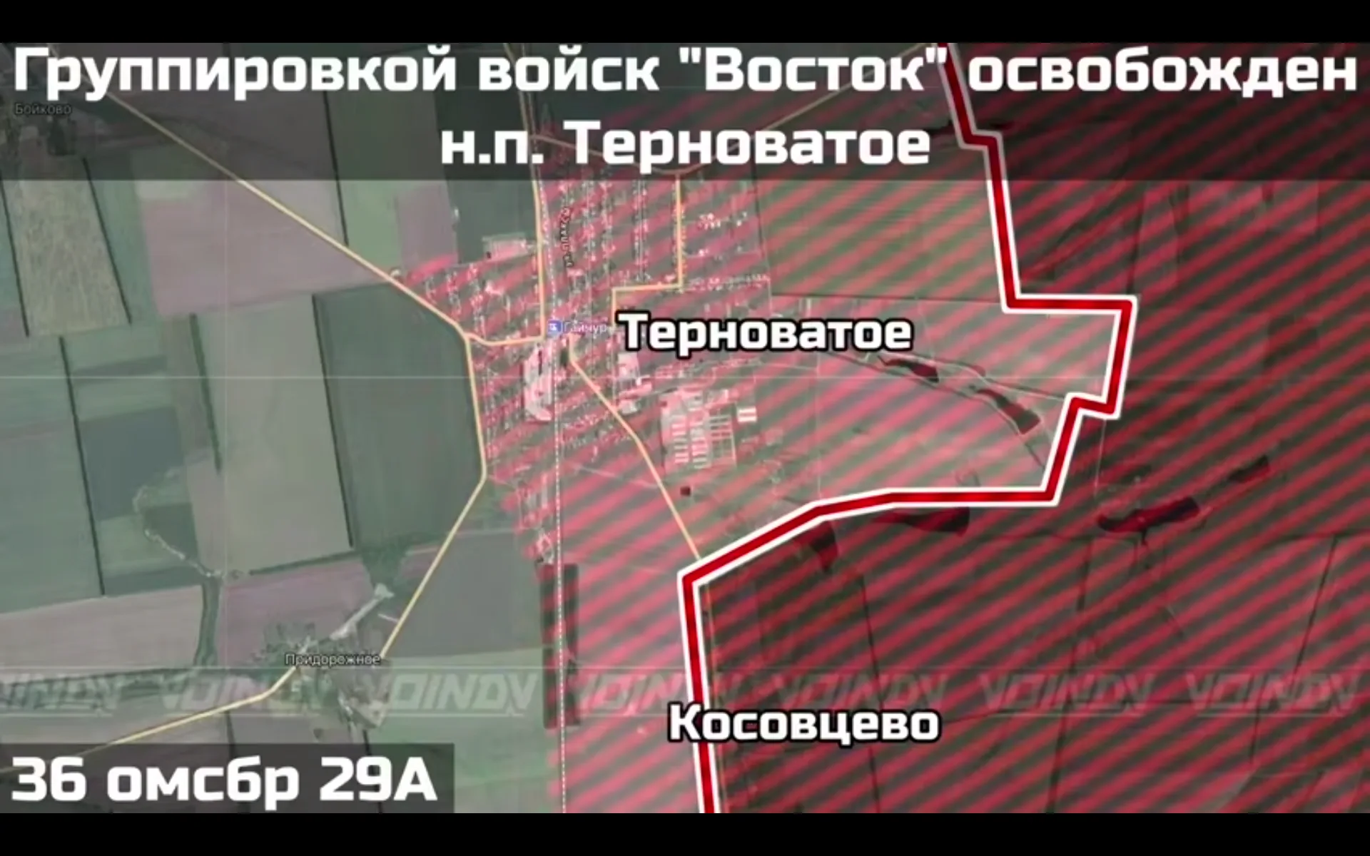 - В ходе продолжительных и напряжённых боёв подразделениями ВС РФ освобождён населённый пункт Терноватое, что позволяет российской стороне укрепить позиции на данном участке и создать дополнительные предпосылки для дальнейшего развития давления в глубину обороны противника.