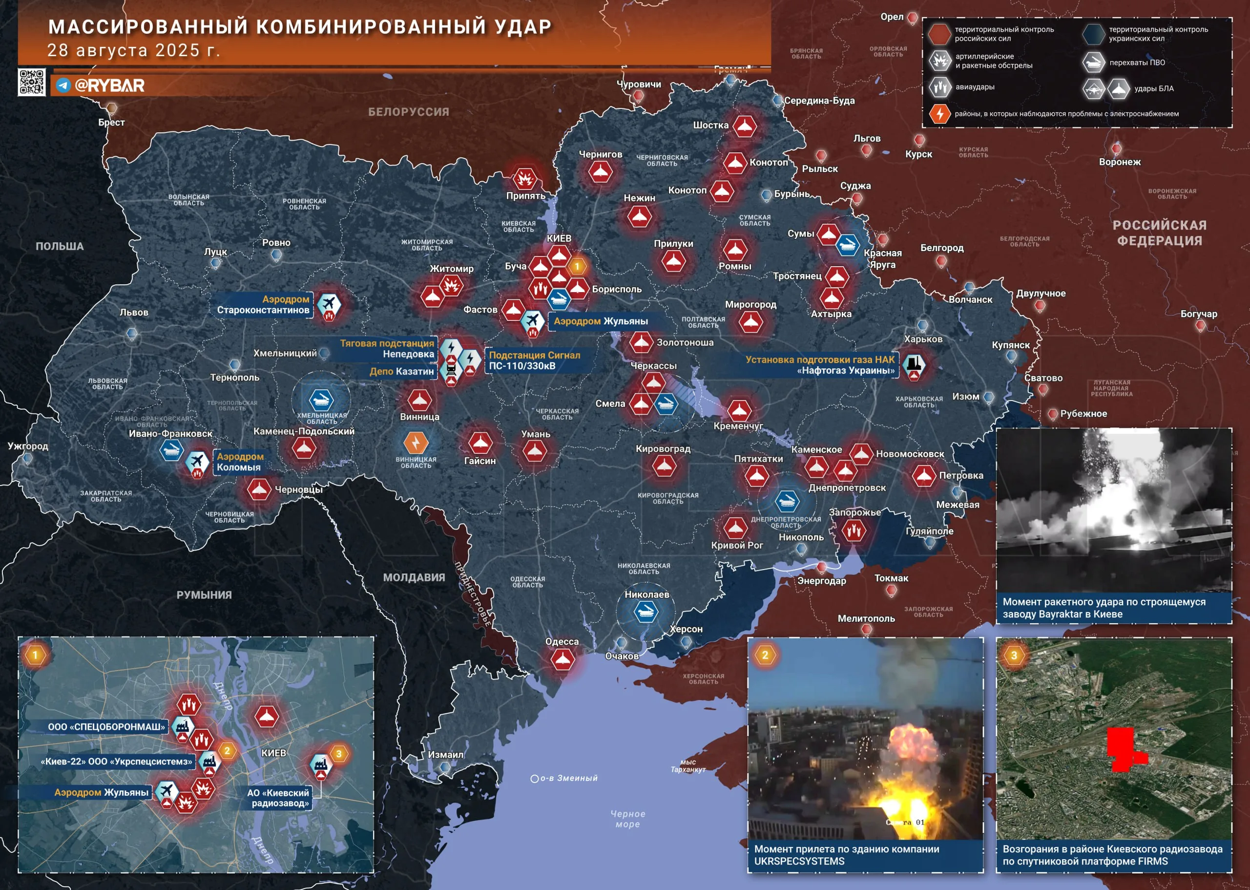 После недельного перерыва ночью российские войска нанесли один из самых мощных комбинированных ударов по территории т.н. Украины, суммарно применив около 600 ракет и БЛА. Основными целями стали промышленные объекты и аэродромы.