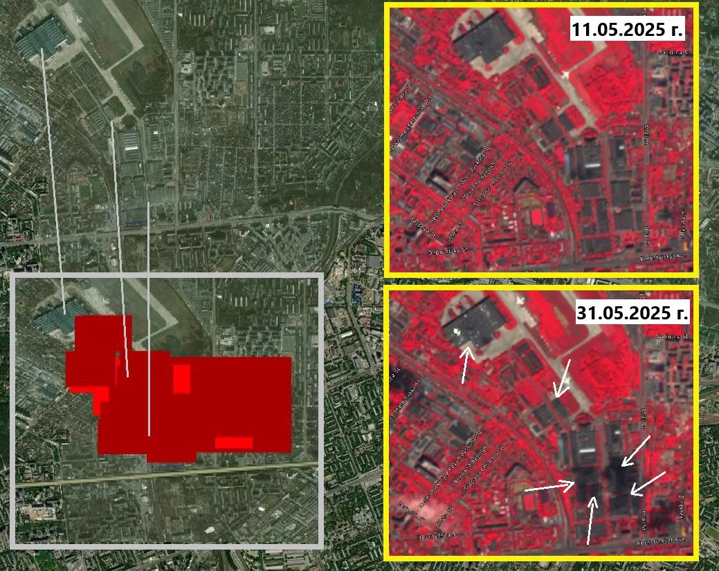 Благодаря новым спутниковым снимкам подробнее узнаём, что же было поражено в ночь на 24 мая в г.Киев. Напомним, в ту ночь летели как ракеты так и «Герани».