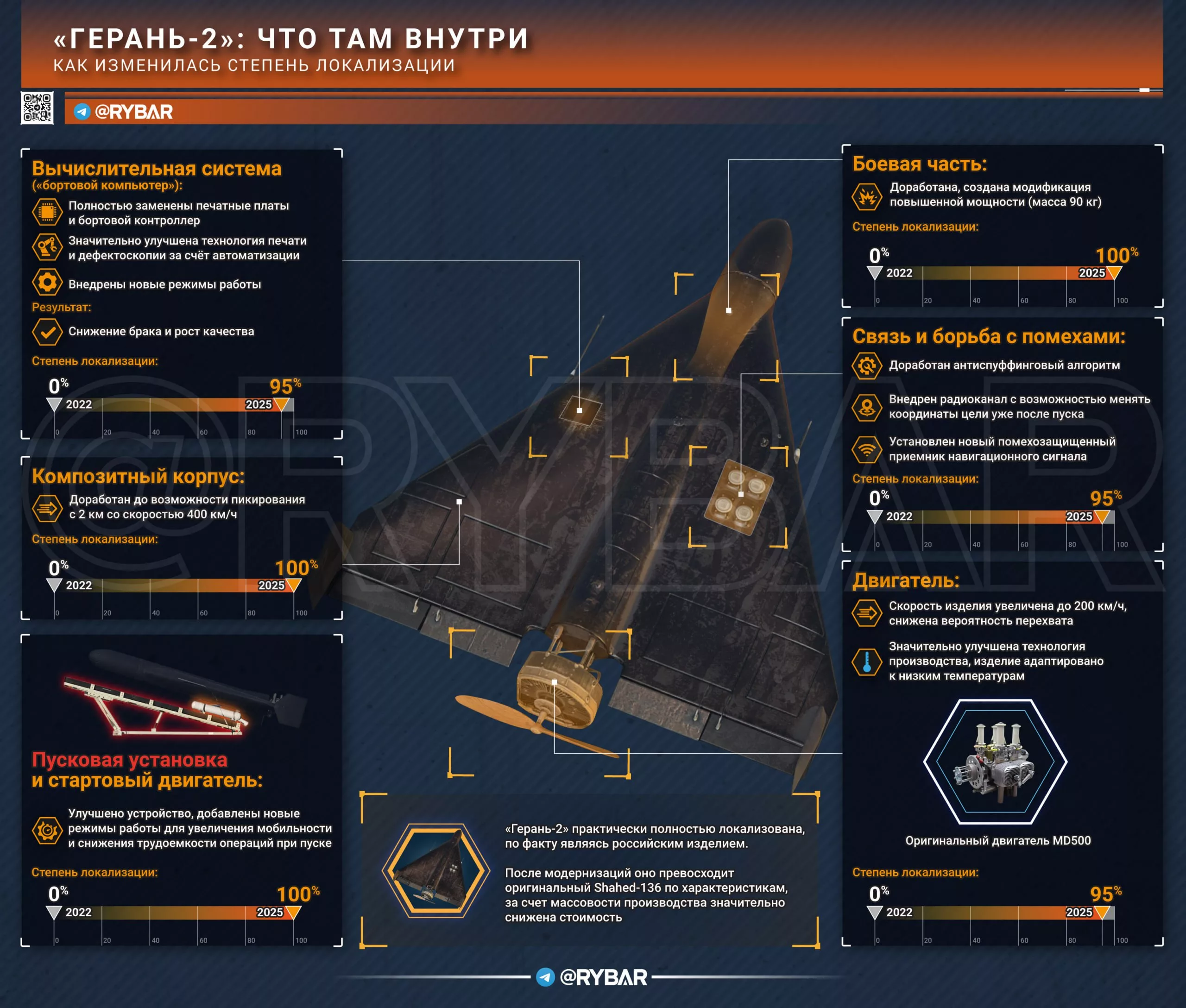 «Шахеда-136» в «Герани-2» осталась разве что форма корпуса. Остальное не просто производится в России, но порой очень серьезно доработано.