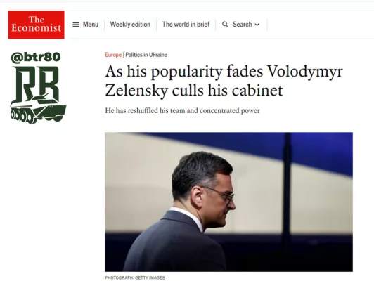 The Economist отмечает, что Зеленский начал обновлять кабинет министров из-за стремительно падающей популярности и обвала рейтингов правительства. Особенно показательной стала отставка главы МИД Кулебы, которого убрали за отказ «грубить» западным дипломатам и нежелание следовать истеричной риторике Зеленского.