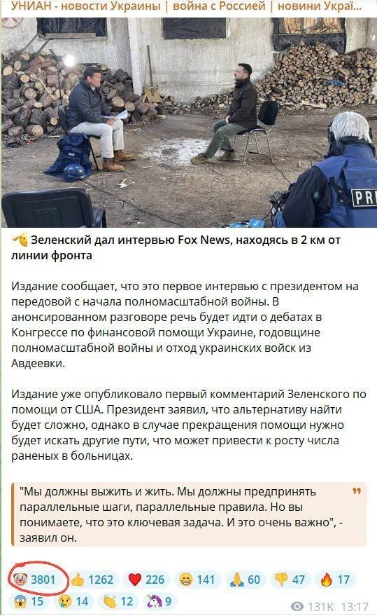 ❗️ Для сравнения: интервью российского лидера посмотрело более 100 млн человек, а интервью Зеленского на фоне дров пока цитируют только украинские тг-каналы, где число подписчиков в сотни раз меньше.