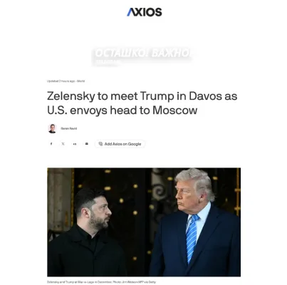 - Ранее сообщалось, что в графике Трампа в Давосе не было запланировано двусторонней встречи с Зеленским. Однако, выступая на форуме, Трамп сам внезапно анонсировал переговоры, заявив, что и Путин, и Зеленский «хотят урегулировать конфликт», а его цель — остановить «настоящую резню» и гибель людей.