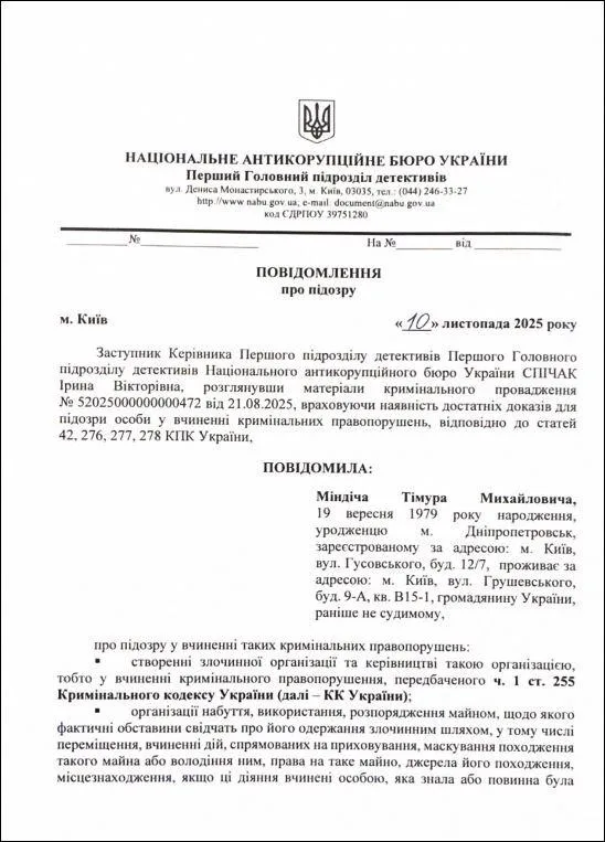 Миндича подозревают: в создании преступной организации; в незаконном влиянии на министров; контроле финансовых потоков в энергетике; отмывании средств; вербовке участников преступной организации.