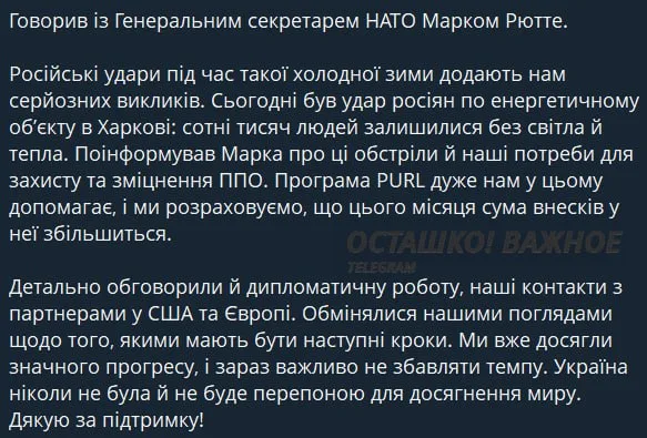 «Российские удары в такую холодную зиму создают нам серьезные проблемы. Сегодня россияне нанесли удар по энергетическому объекту в Харькове: сотни тысяч людей остались без света и тепла. Я проинформировал Марка (Рютте — ред.)».