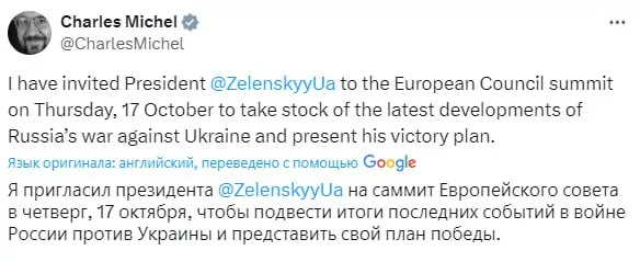 Об этом в соцсетях написал президент высшего политического органа ЕС Шарль Мишель. Он сам пригласил президента Украины на мероприятие.