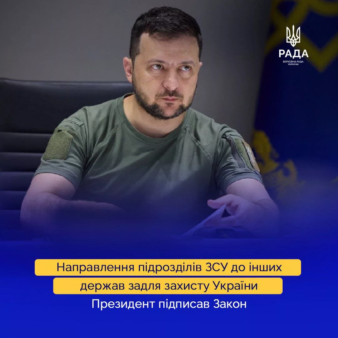 «Зеленский подписал закон о праве направлять подразделения ВСУ в другие государства в период действия военного положения», — говорится на официальном сайте Верховной Рады. Отмечается, что решение об отправке принимается главой государства с обязательным внесением законопроекта в парламент.