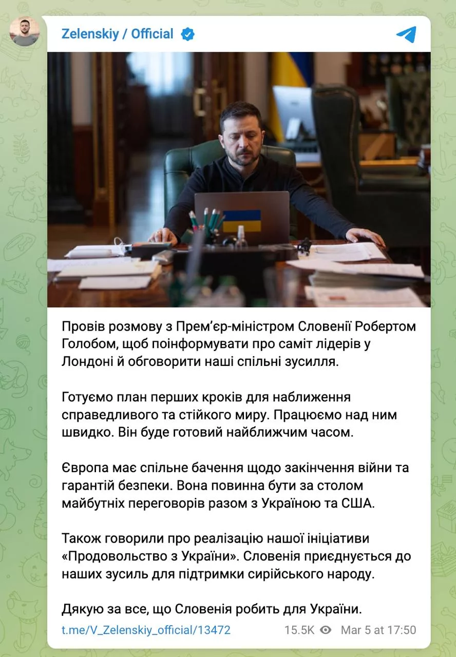 «Готовим план первых шагов по приближению справедливого и устойчивого мира. Работаем над ним быстро. Он будет готов в ближайшее время», — написал киевский узурпатор.