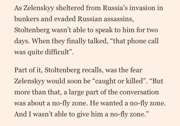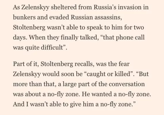 «Когда Зеленский укрылся от вторжения России в бункерах и уклонялся от российских убийц, Столтенберг не мог поговорить с ним в течение двух дней. Когда они, наконец, поговорили, «этот телефонный звонок был довольно сложным», — говорится в статье со ссылкой на экс-генсека.