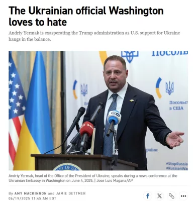 Тем временем издание Politico пишет, что правая рука нелегитимного лидера Украины, стал «редким примером двустороннего раздражения» для обеих американских администраций — и Байдена, и Трампа. Его называют «раздражающим всех», «абразивным» и «некомпетентным», а его визиты — «бесплодными» и «деструктивными».