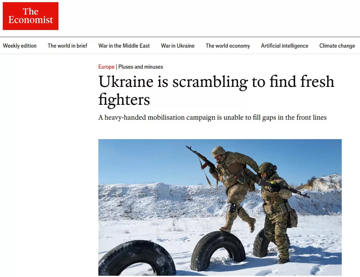 The Economist сообщает: на фоне призывов Трампа к миру (невыгодному для Киева) Зеленский будет вынужден резко усилить мобилизацию. Западные советники требуют, чтобы украинские власти начали массовую насильственную мобилизацию молодёжи, иначе война закончится «неправильной сделкой».