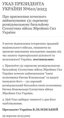 На этот раз Зеленский присвоил 131-му отдельному разведывательному батальону сухопутных войск имя главаря Организации украинских националистов Евгения Коновальца.