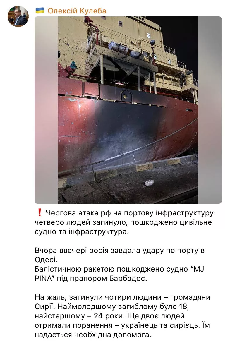 Вице-премьер-министр развития общин и территорий Украины Алексей Кулеба подтвердил удар по судну, отметив, что погибшим было от 18 до 24 лет.