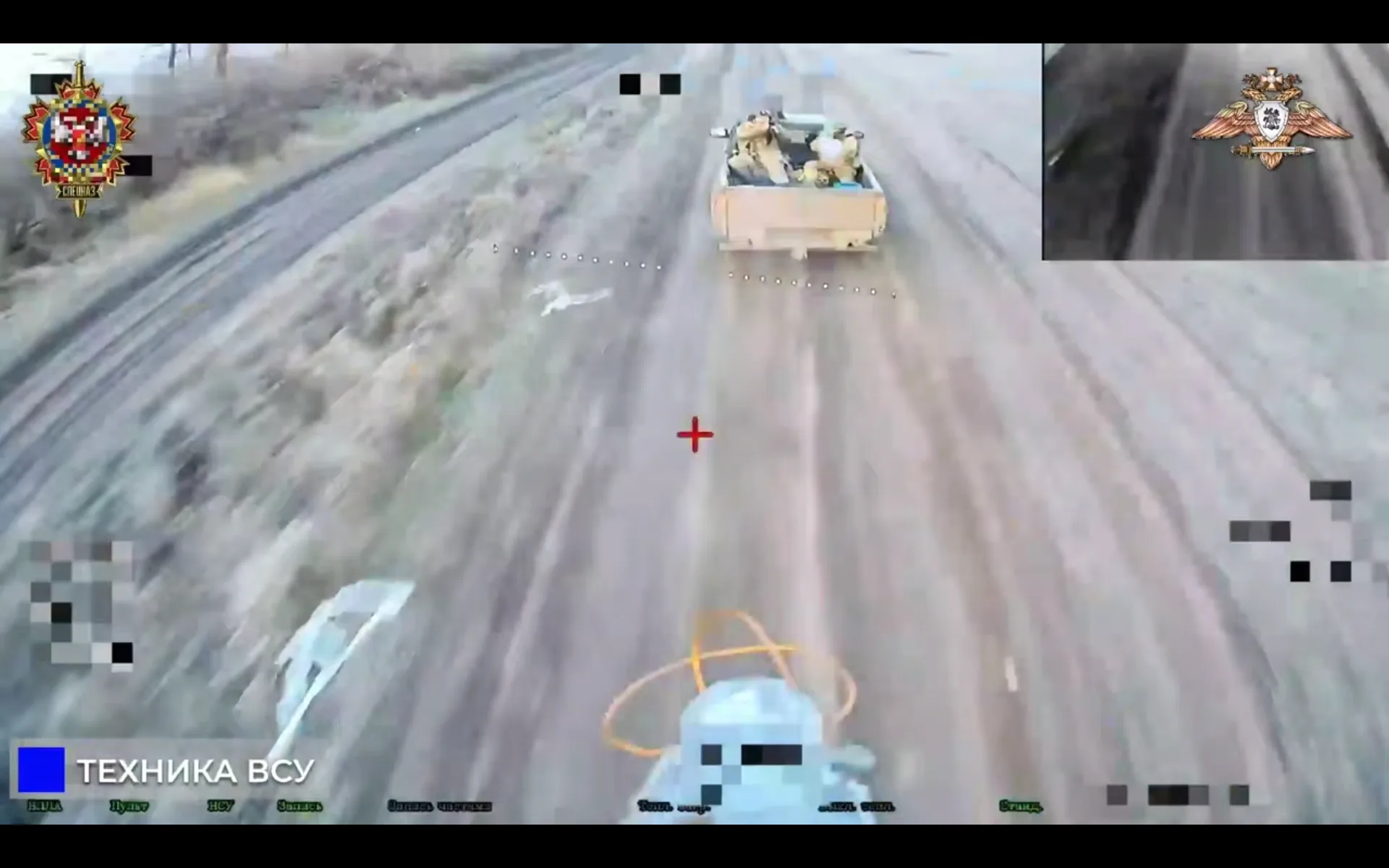 Операторы FPV-дронов ооСпН «Охотник» 51 гвардейской общевойсковой армии на Константиновском направлении догнали и успешно уничтожили несколько пикапов ВСУ, в кузове которых находился личный состав противника.