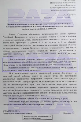 Теперь железнодорожникам, работающим на восьми приграничных станциях региона: Климов, Новенькое, Трубчевск, Холмечи, Суземка, Жеча, Сураж и Погар — будут выдавать бронежилеты и шлемы для защиты от осколочных ранений.