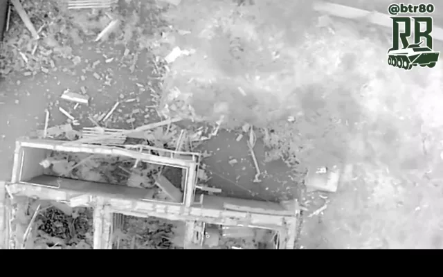 Покровское направление. Бандеровец решил спрятаться в постройке, но не учел, что в ней отсутствует крыша. Нацисту удалось пережить две сброшенные гранаты, но после третьего сброса боевик отправлен к своему кумиру.