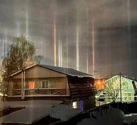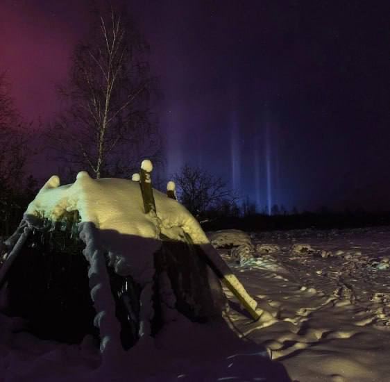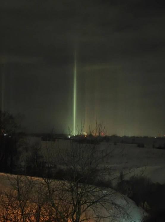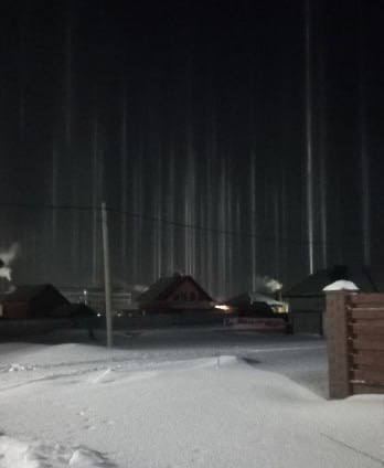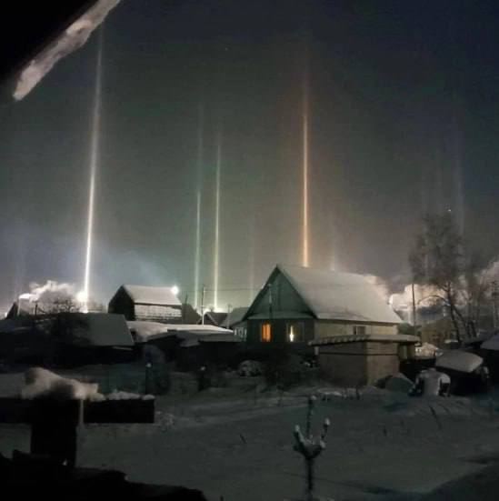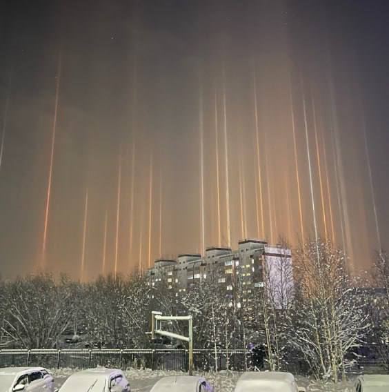 ❗️ Такие столбы обычно возникают при морозе во время заката или рассвета, когда парящие в воздухе микрольдинки отражаются в лучах.