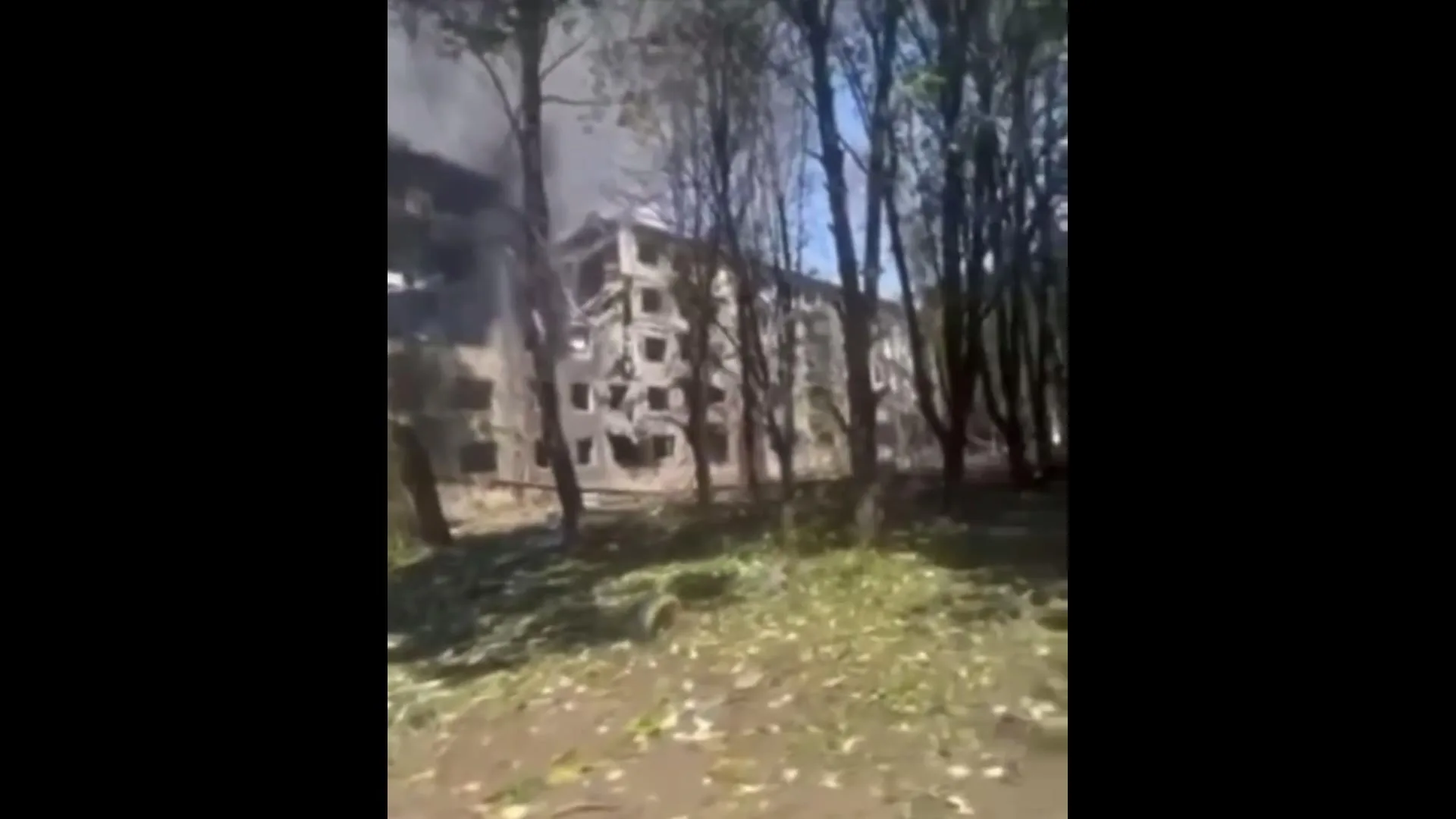 - здание получило точное попадание — зафиксированы повреждения средней части фасада, при этом нижние этажи целы, обрушения нет;