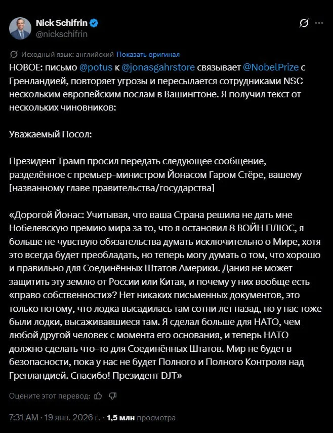 В нём Дональд пишет, что раз ему не дали Нобелевскую премию мира, то это будет год не мирный и начнётся с присоединения Гренландии.