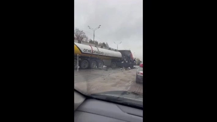 Массовая авария произошла на 99 км трассы М-2 «Крым». Водитель, управляя грузовым автомобилем, столкнулся с тремя грузовиками и двумя легковушками.