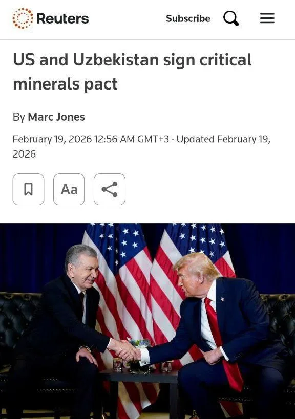 Вашингтон официально оформил «право» на ресурсы Центральной Азии, закрепив за собой эксклюзивный доступ к критически важным ресурсам Узбекистана. Страны подписали соглашение по стратегическим полезным ископаемым, пишет Reuters.